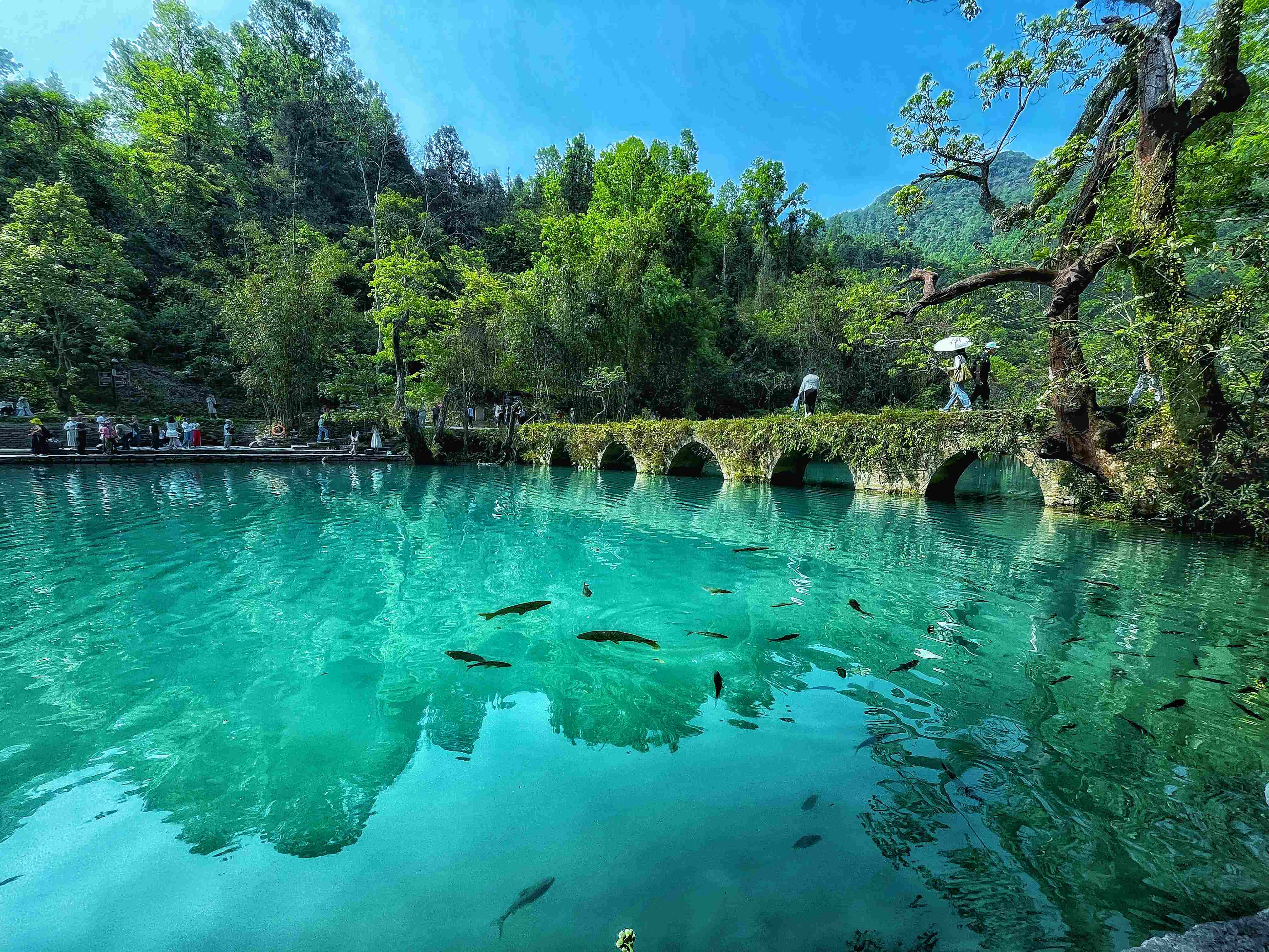 小七孔石桥桥身两侧蔓草丛生,桥下之水清澈见底,两岸景致葱郁秀美,仙气缭绕,漫步于小七孔古桥之上,仿佛置身于一幅山水画卷之中。