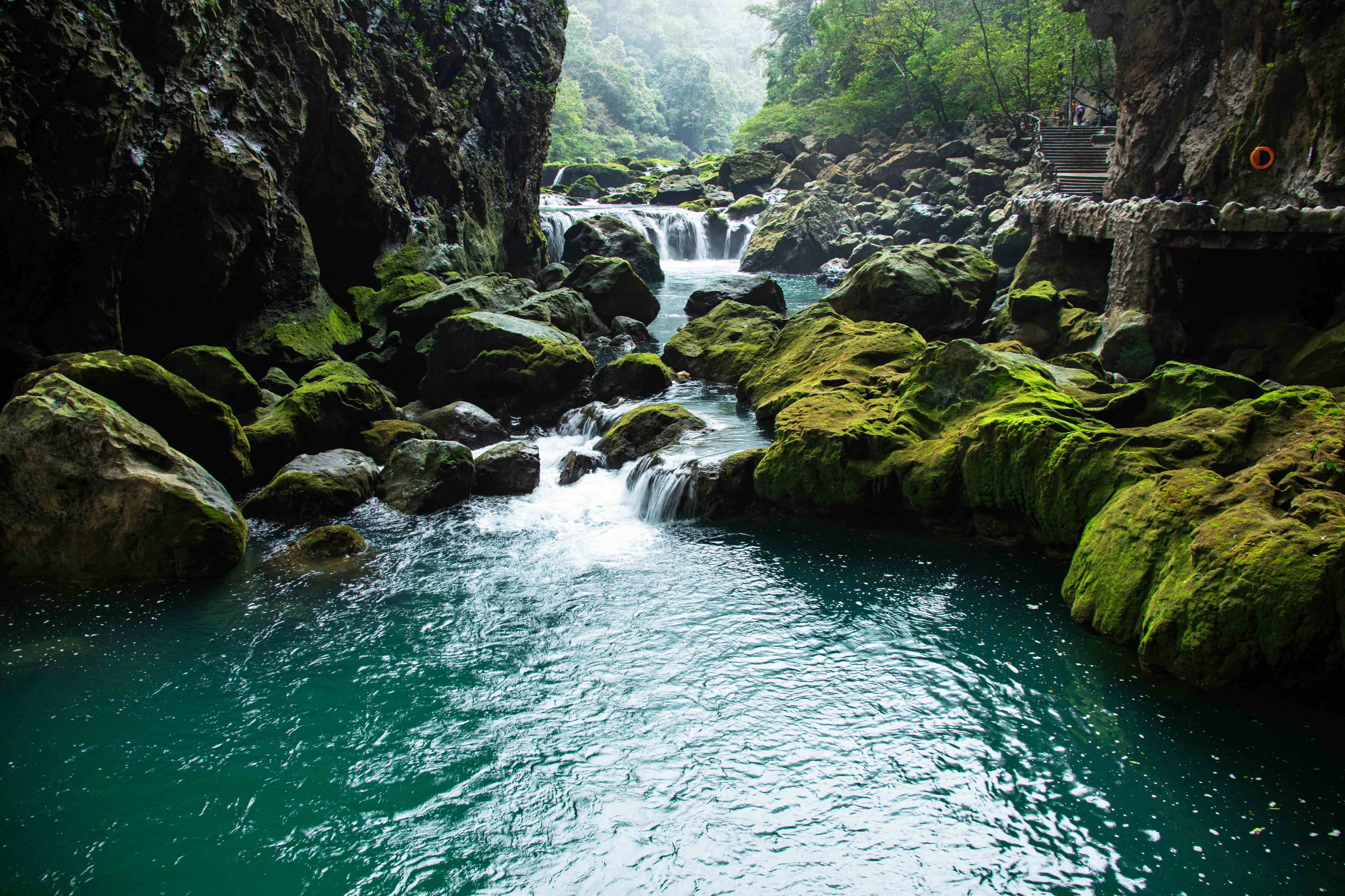 68级跌水瀑布在1.6公里的峡谷里,千姿百态的瀑布跌水竞领风骚,争奇斗妍,构成风情万种的动态水景,令人目不暇接。