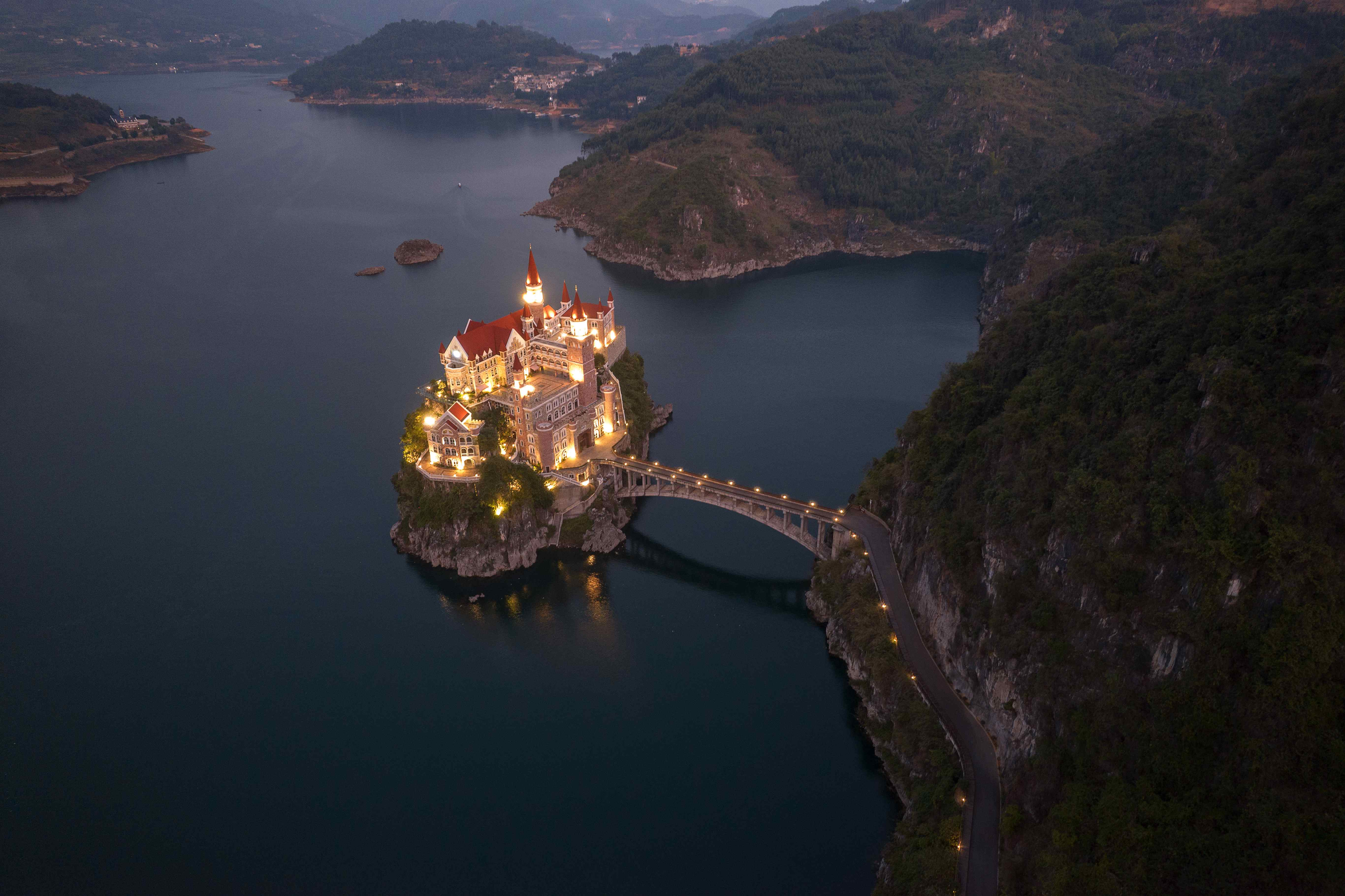 万峰湖的魅力,在于其“山水相依”的宏伟景致。湖周被上万座青翠的喀斯特山峰环绕,形成了“山中有水,水中有山”的奇特景观。湖中星罗棋布地散落着数十个全岛与半岛,以及上百个宁静的港湾,移步换景,如同徐徐展开的山水长卷。乘船游览是感受其壮美的绝佳方式。从红椿码头启航,您可在清澈见底的湖水中穿梭,近距离观赏如水上石林般的锥状峰丛,并远眺湖心那座梦幻的哥特式建筑——吉隆堡,它如同童话中的城堡,为这幅东方山水画增添了一抹浪漫的异域情。天气晴好时,湖水能见度可达2米以上,光影变幻,使湖面在一天之中呈现出不同的景致,因而享有“一日三景”的美誉。