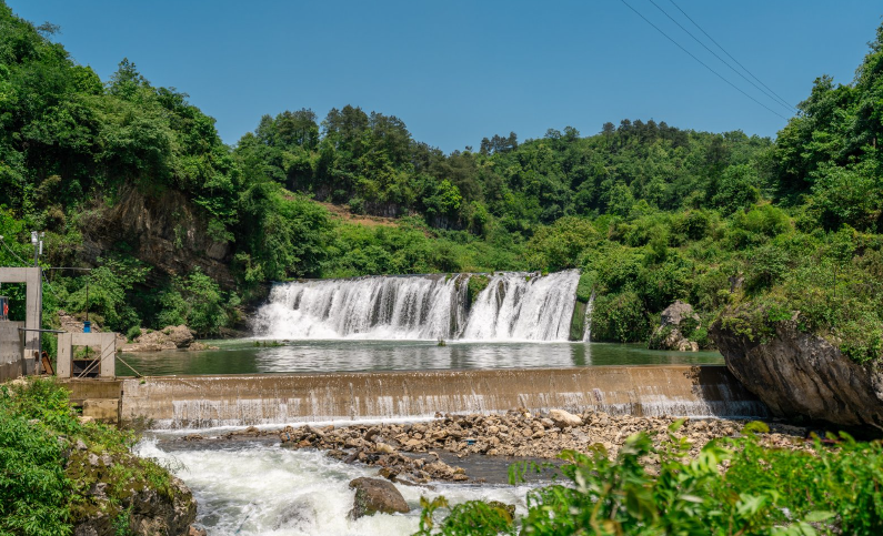 穿洞河瀑布位于瓮安县城北的瓮安河上,是一处典型的喀斯特地貌形成的天然溶洞瀑布。这里最独特之处在于瀑布后方隐藏着一条天然横洞,形成“人从水下过,水在头上流”的奇特景观。穿越洞穴时,透过洞内三个“巨窗”般的开口,可以看到水帘时分时合、时薄时厚的变幻景象。夏季丰水期,瀑布宽达50米的水帘倾泻而下,在阳光下常形成彩虹奇观。